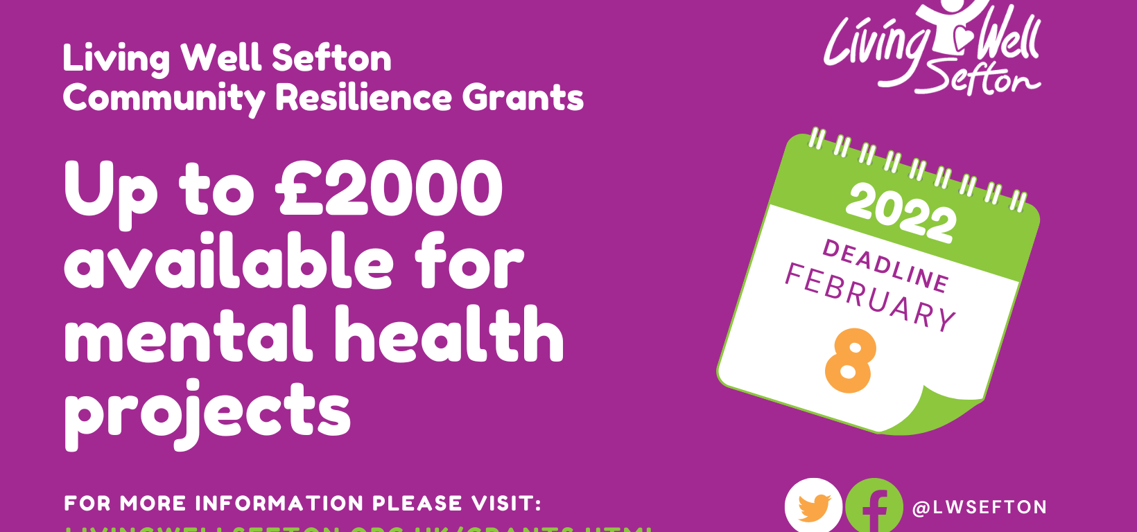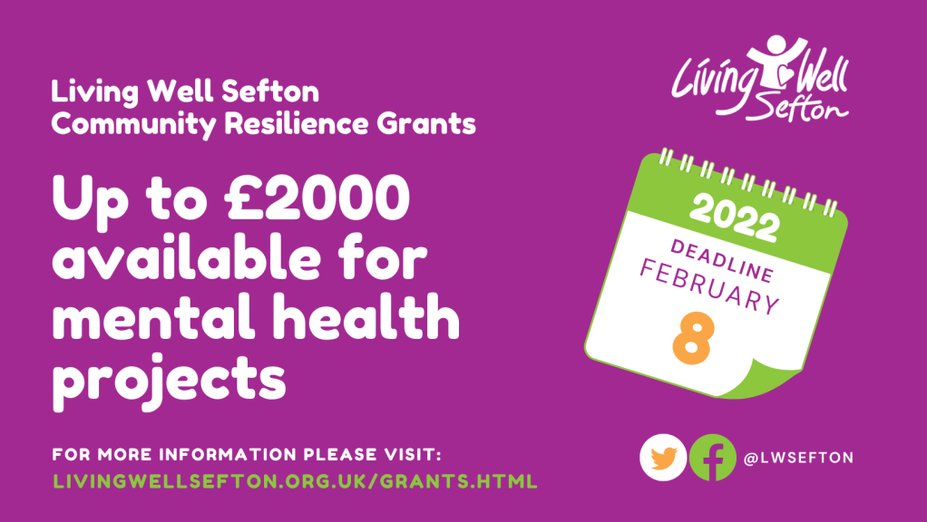 Here at Living Well Sefton we offer a range of grants to companies, individuals, charities and organisations who service the Sefton area in some way. Each grant has its own criteria and aims, but our Community Resilience Grant is a consistent way for groups to gain funding for different projects. Our latest grant round is open now for applications and we welcome any groups or companies in Sefton who are helping to address low level mental health and wellbeing needs in the region to apply.